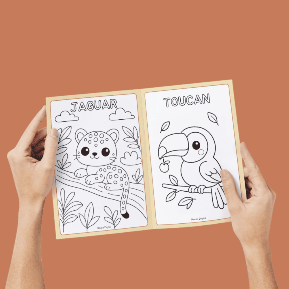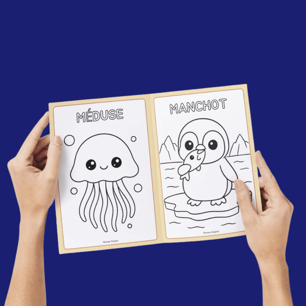 Un animal par page, avec son nom écrit en haut, coloriable par l’enfant également.